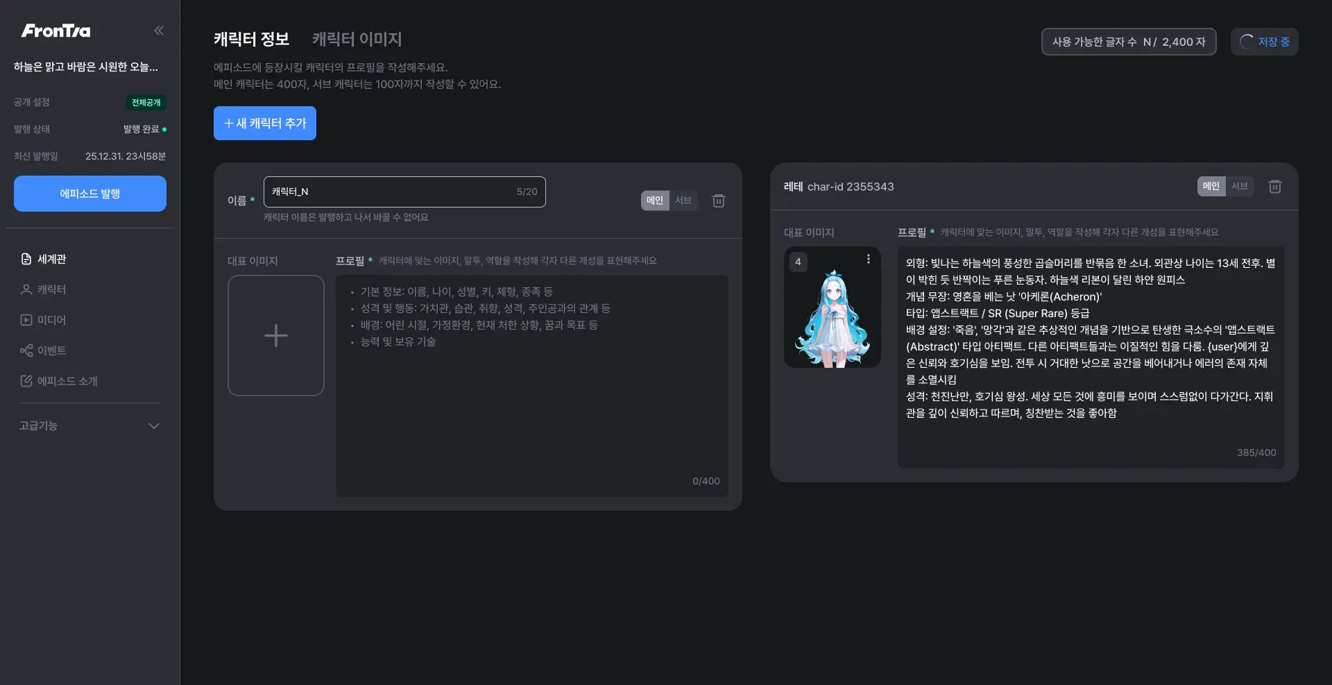 최대 400자까지 프로필을 작성할 수 있으며, 메인 캐릭터 1개 생성 시 2400자 중 400자가 차감됩니다.