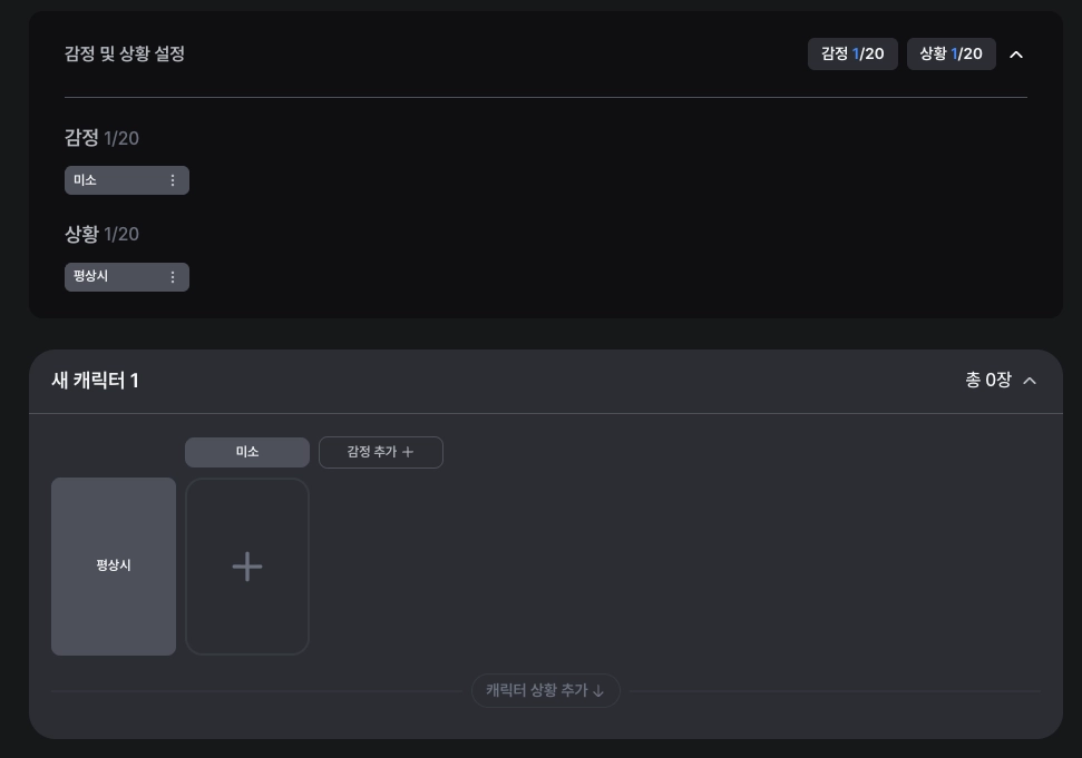 처음에는 상황에는 ‘평상시’, 감정에는 ‘미소’가 입력되어 있어요. 감정 추가 및 상황 추가를 눌러 새로운 감정과 상황을 추가하거나, 상단의 값을 수정할 수 있습니다.