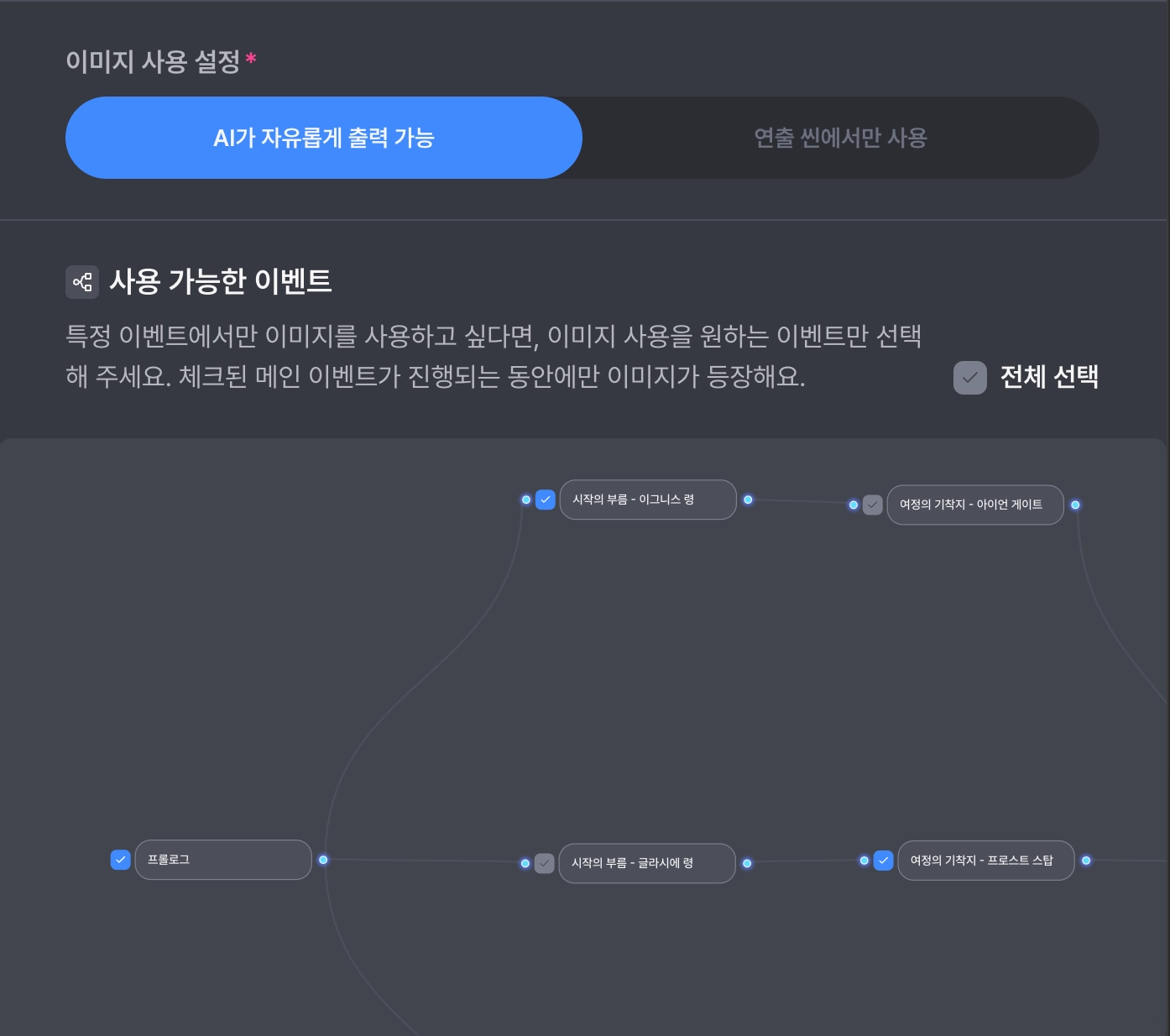 캐릭터 이미지 등록 시 하단에 있는 ‘사용 가능한 이벤트’를 직접 선택하여 특정 이벤트에만 해당 이미지가 나올 수 있게끔 조절할 수 있어요.