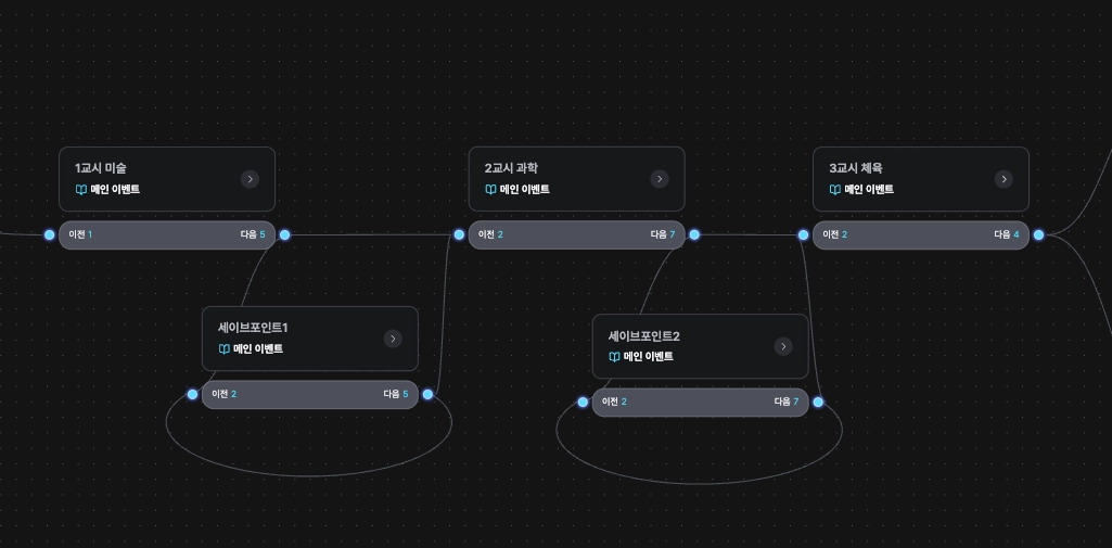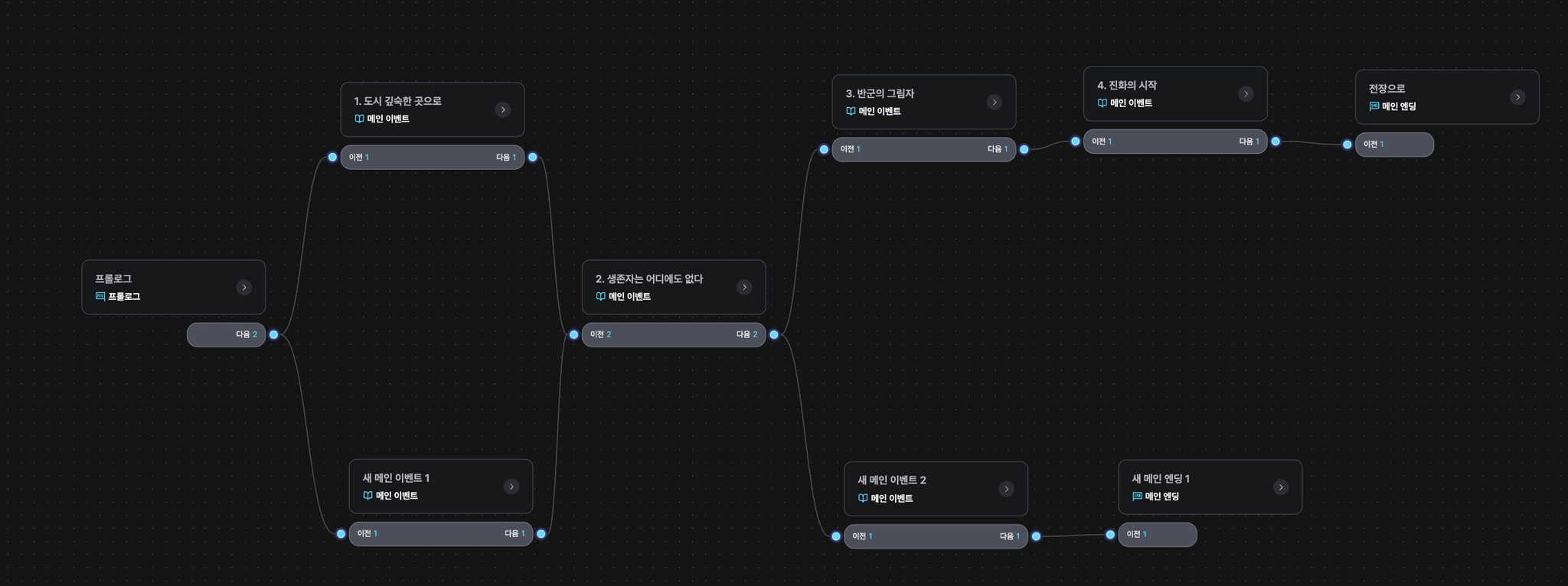메인 이벤트를 여러 개 연결하고, 조건에 따라 다음 이벤트를 지정해서 원하는 스토리 구조를 만들어보세요!