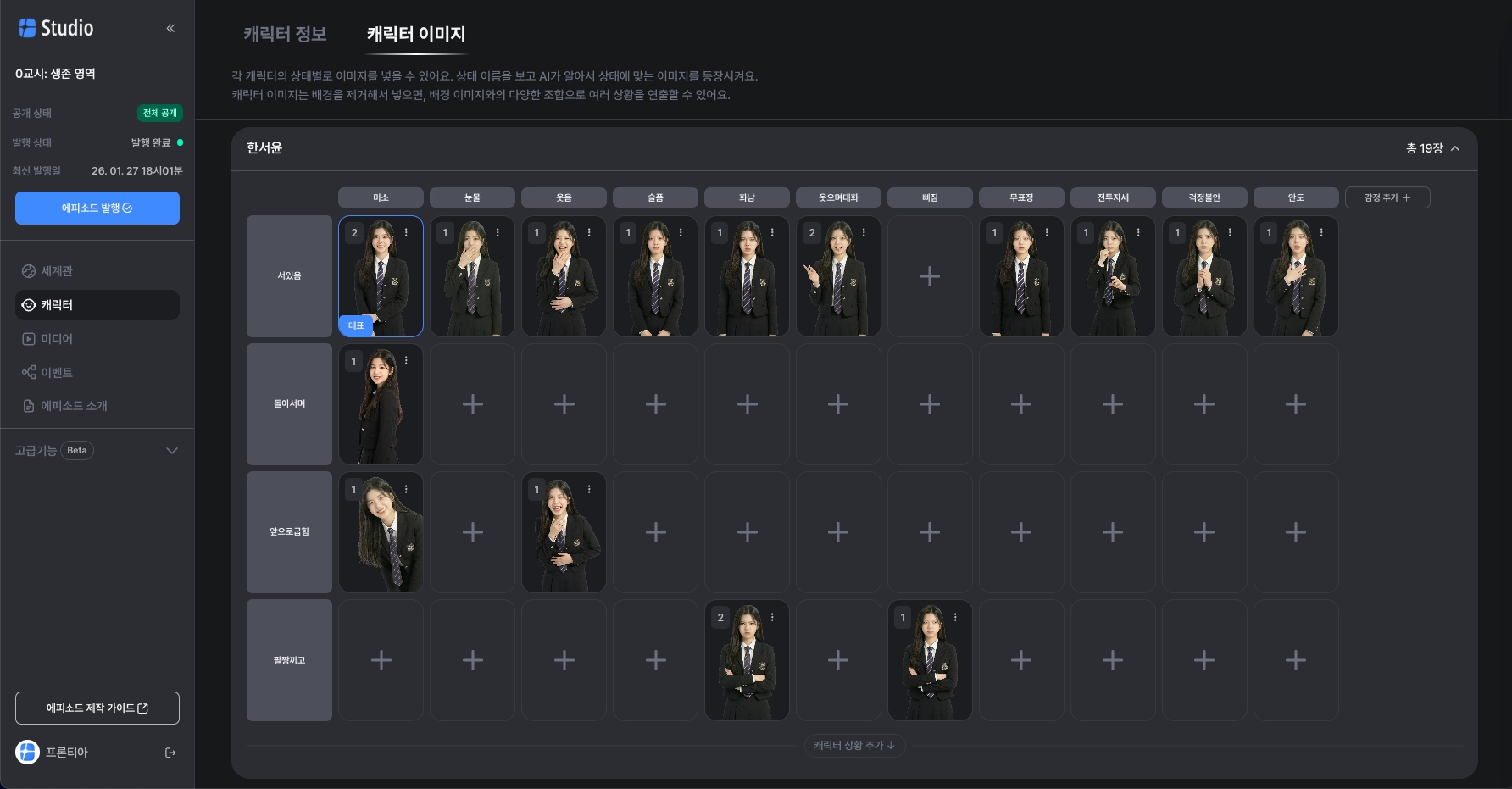 개성있는 설정과 다양한 상태 이미지를 넣어주면, AI가 적재적소에 캐릭터를 등장시켜요.