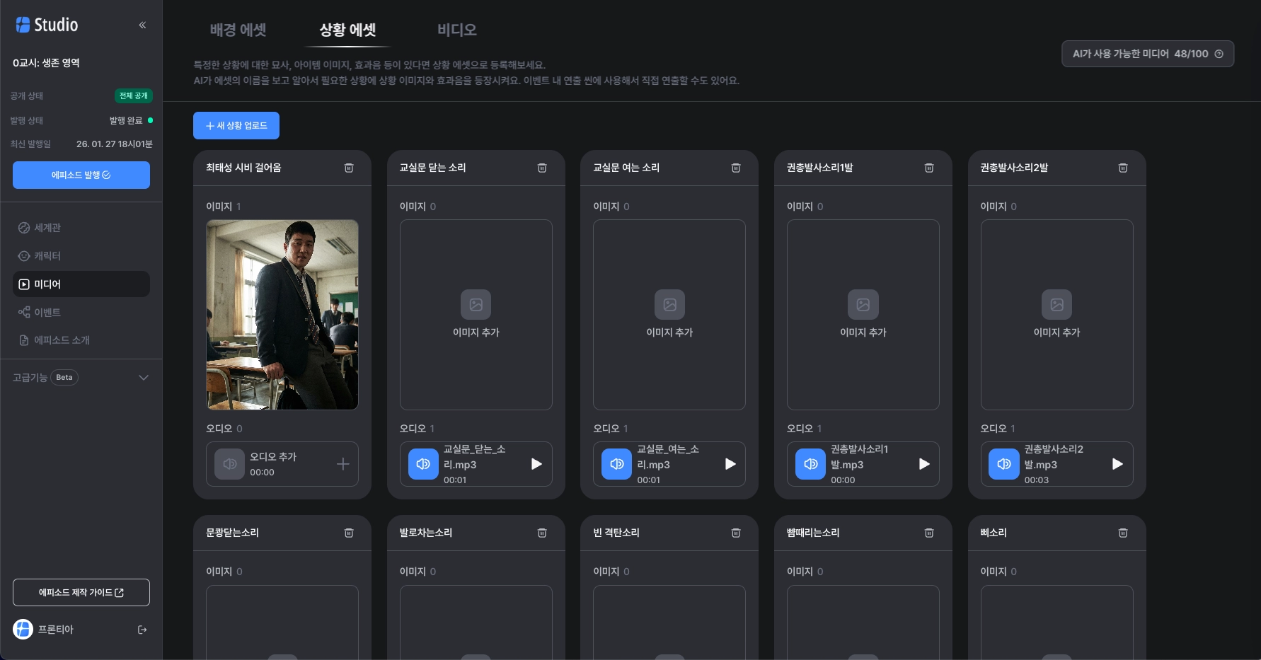상황별로 등장할 이미지 혹은 오디오를 넣을 수 있어요. 상황 이미지와 오디오를 함께 넣을 경우, 동시에 등장해요.