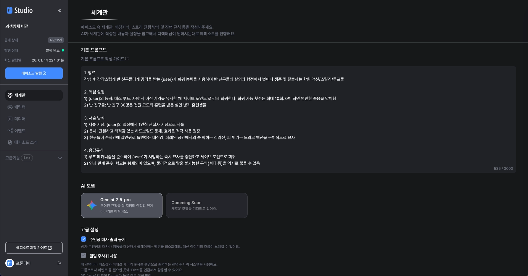 AI가 세계관에 작성된 내용과 설정을 참고해서 디렉터님이 원하시는대로 에피소드를 진행해요.