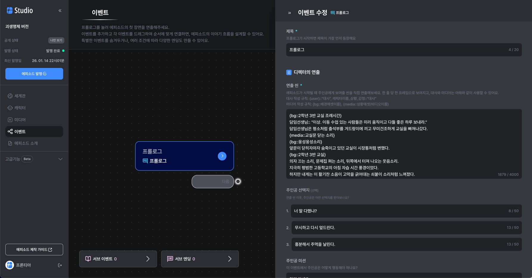 프롤로그(필수): 에피소드의 시작을 직접 연출하세요.