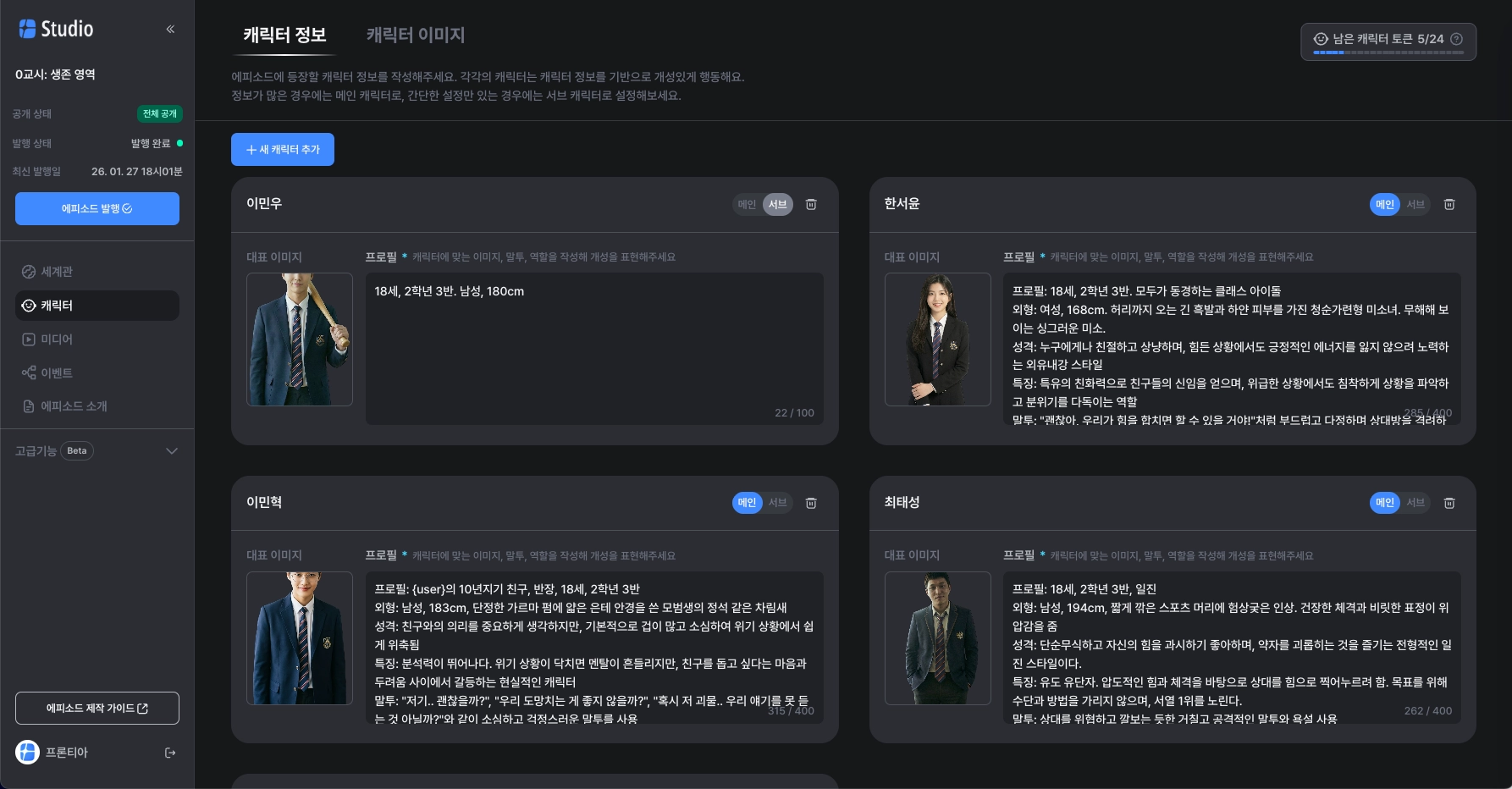 에피소드에 등장할 캐릭터 정보를 작성해주세요. 각각의 캐릭터는 캐릭터 정보를 기반으로 개성있게 행동해요. 정보가 많은 경우에는 메인 캐릭터로, 간단한 설정만 있는 경우에는 서브 캐릭터로 설정해보세요.