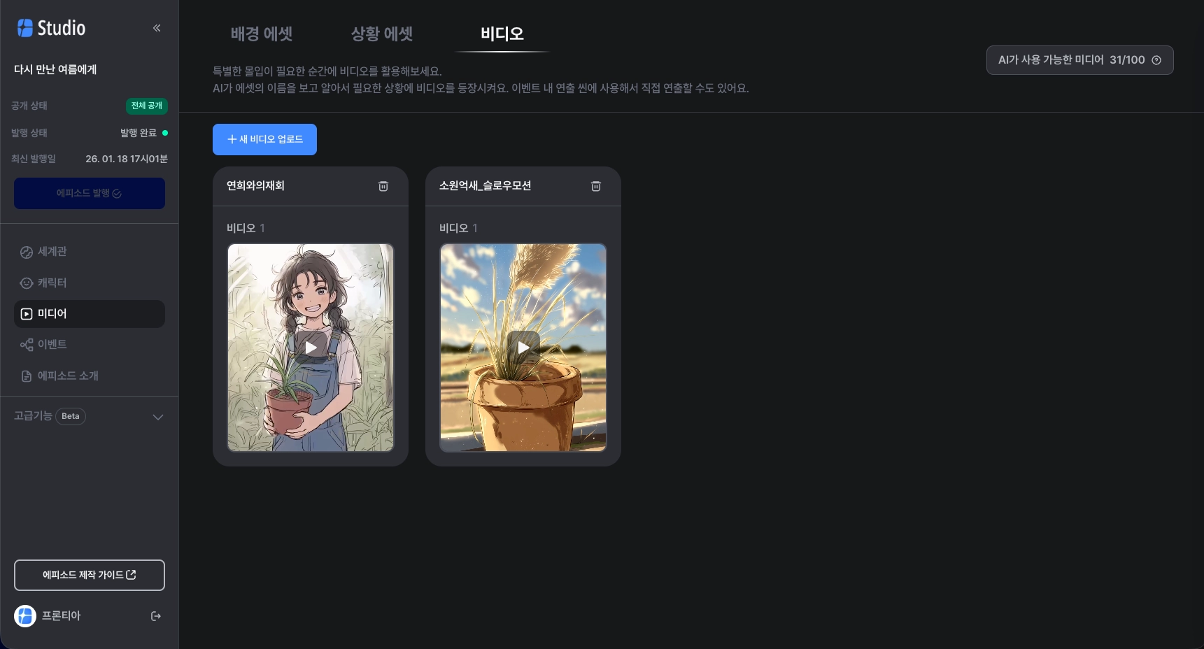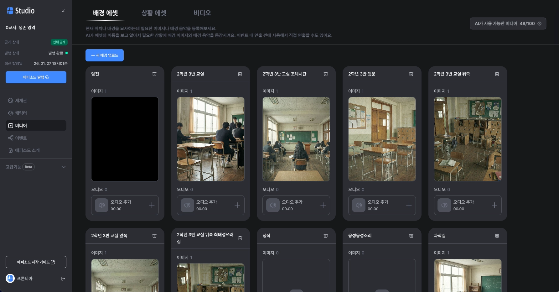 에피소드 속 세계를 생생하게 만들어 줄 다양한 배경과 상황 미디어를 넣는 곳이에요.