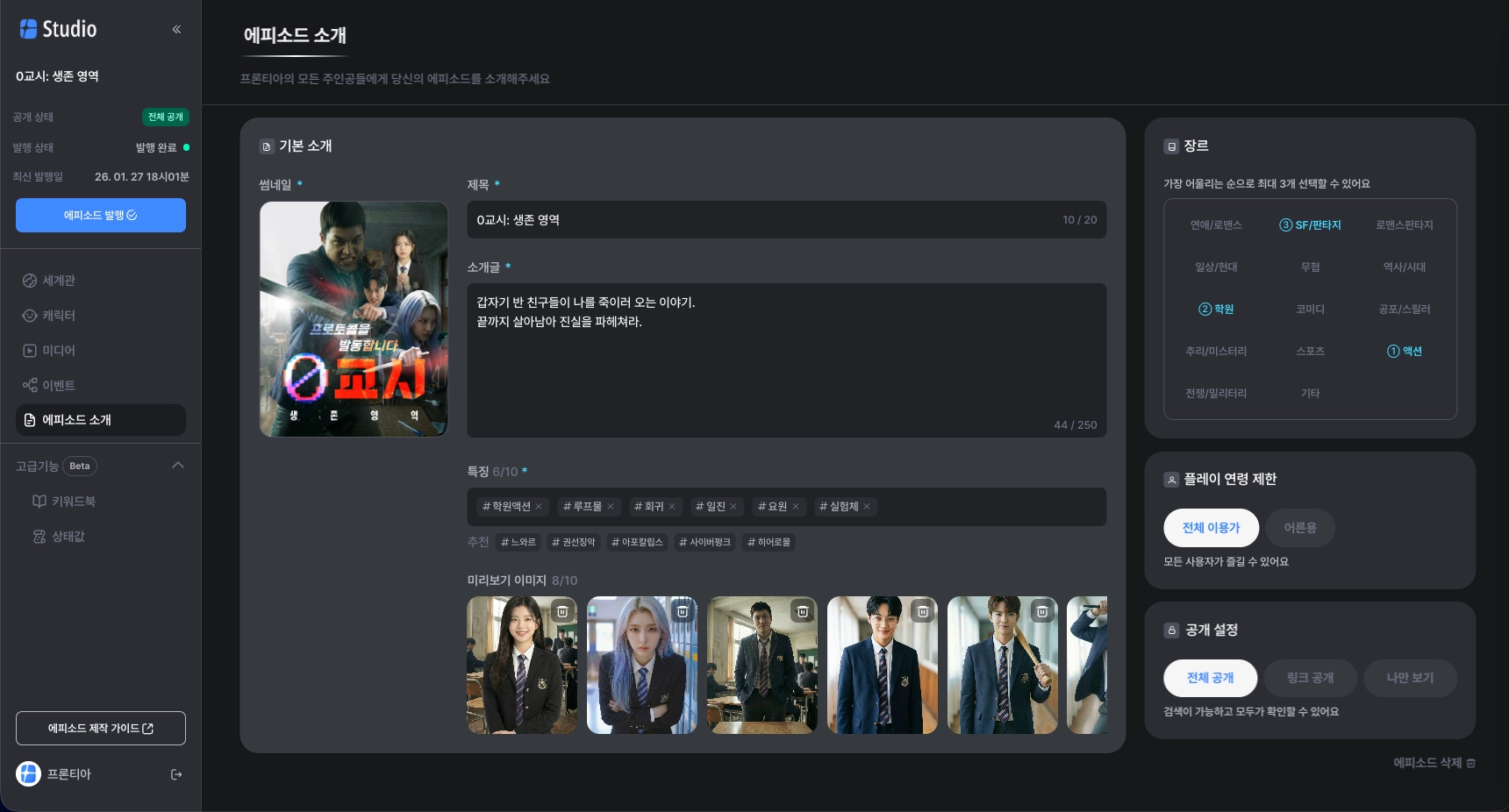 에피소드 발행: 모든 내용을 작성한 후 왼쪽 상단의 [에피소드 발행] 버튼을 누르면 제작 끝!